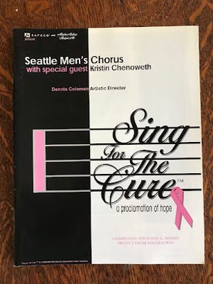 In 2001, Seattle Men’s Chorus presented a song cycle promoting breast cancer awareness, “Sing for the Cure.” We invited Kristin to sing the solo parts in the piece, which was the second act of the concert. In the first act, Kristin did her own set as well as singing several songs together with the chorus.